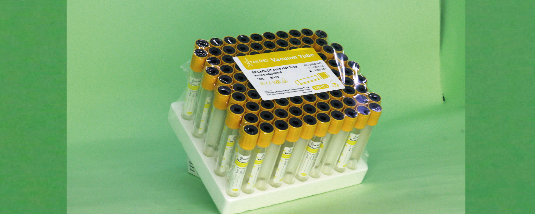 Glass vacuum tube for blood collection, contains gel separator and clot activator. Used in clinical biochemistry tests to obtain clear serum. Dimensions 13×100MM, volume 5ML. Non-sterile, suitable for lab use