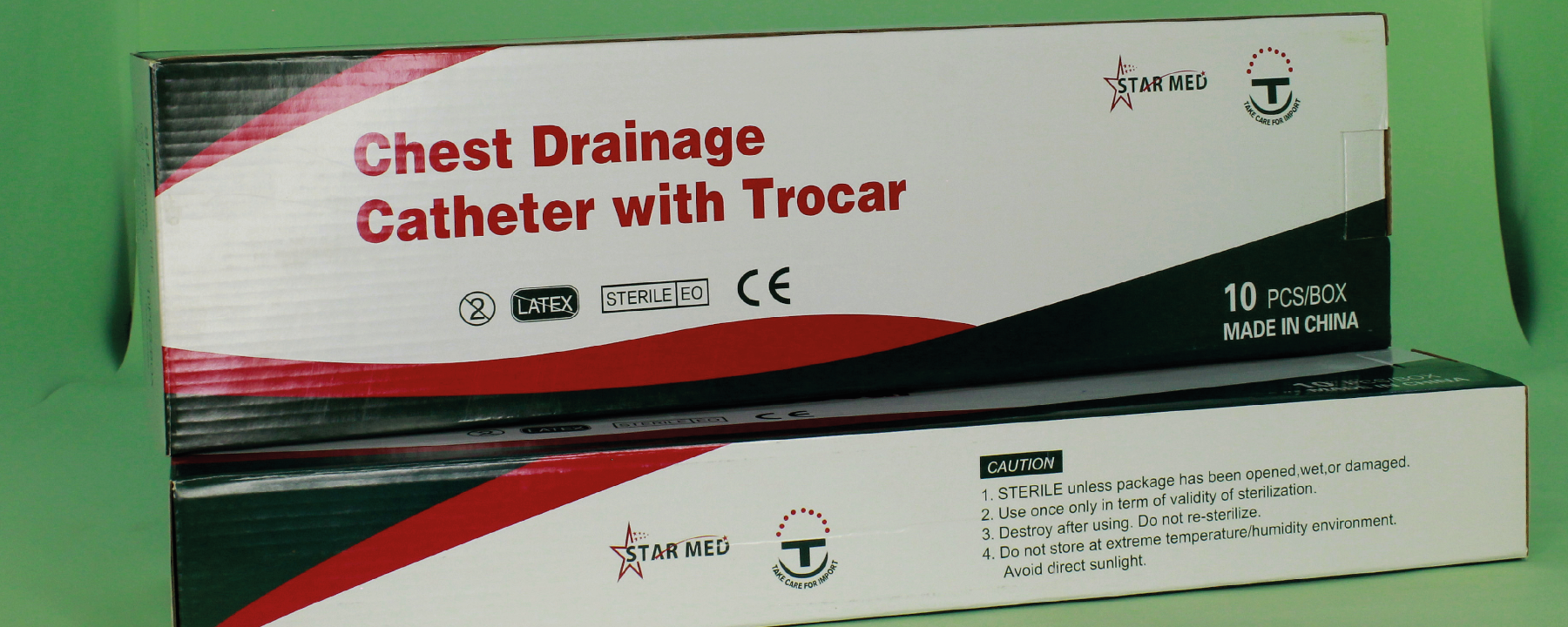 Medical catheter used for draining air or fluid from the chest cavity. Made of flexible transparent PVC, equipped with a trocar for easy insertion. Sterile and designed for surgical or emergency use