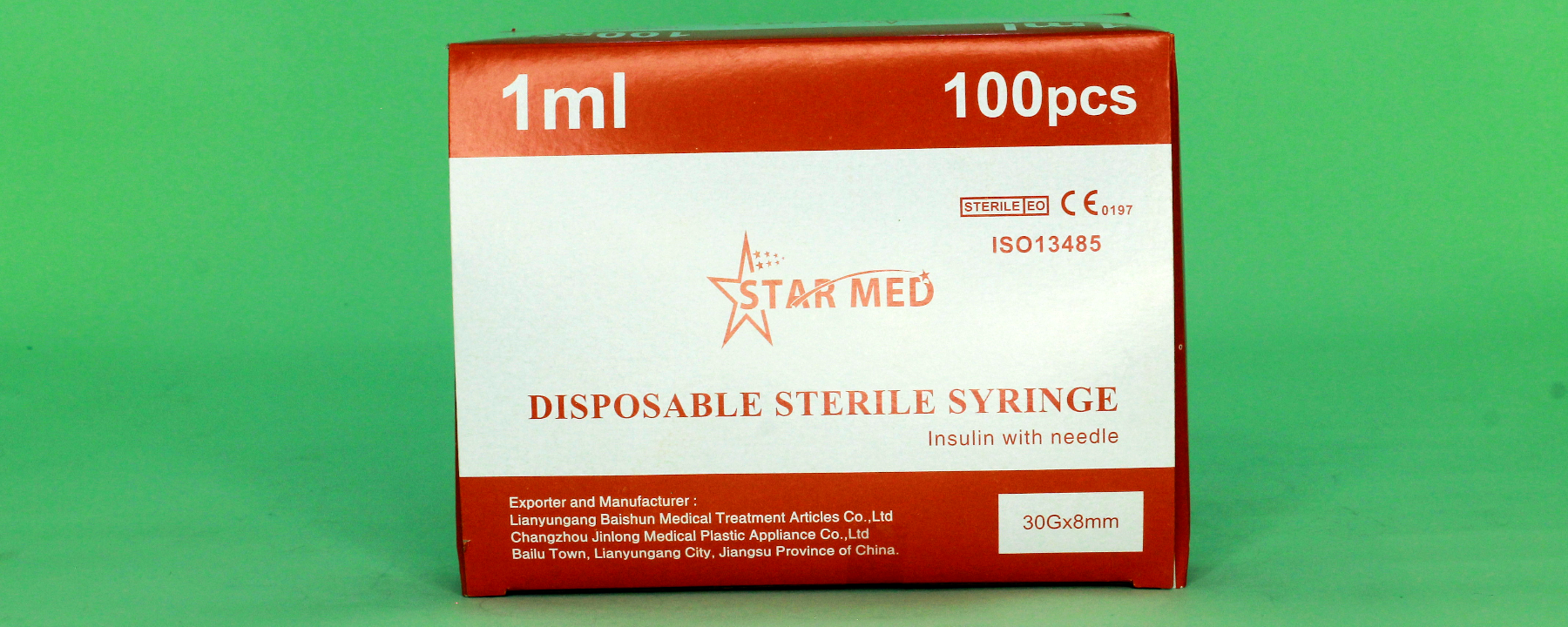 Sterile insulin syringe for subcutaneous injection, single-use only.