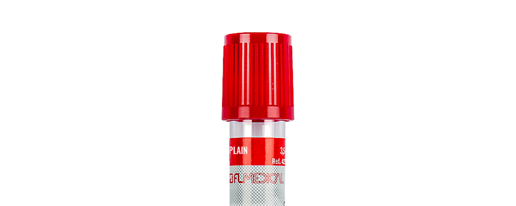 Vacuum blood collection tube, made of glass, plain (no additive), with red cap. Used for general laboratory blood testing